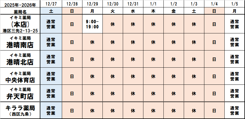 2025-2026年末年始 臨時休業のご案内LINEで処方箋を送って時間短縮↓オススメ↓※全店舗 LINE処方箋予約・LINEで薬剤師に相談 に対応しています。※全店舗 電子処方箋 に対応しています。※全店舗 オンライン...